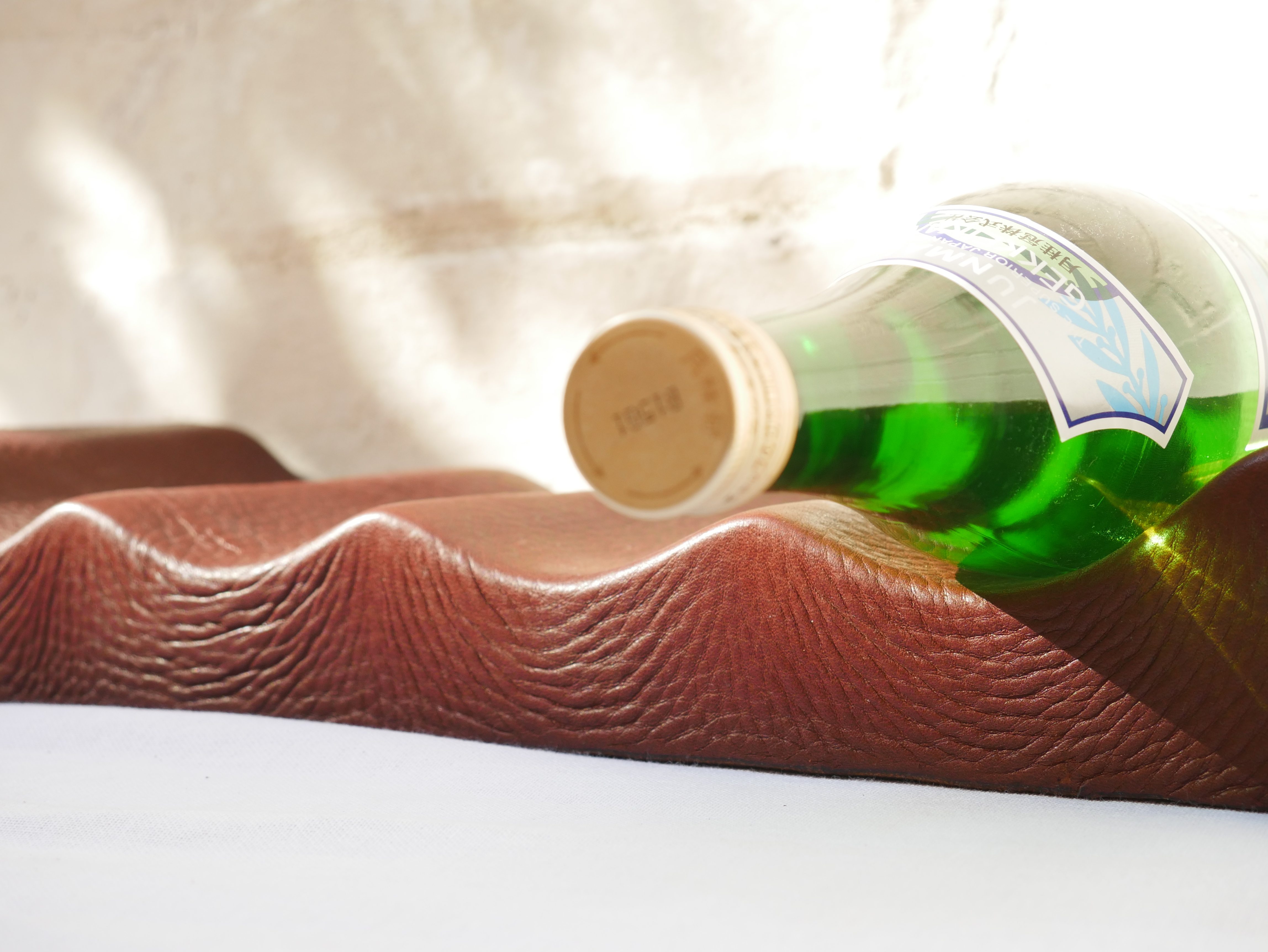 ‘Block’ resulted from a design challenge I set myself – to create a benchtop bottle storage solution using a faulty batch of wine rack pieces that were destined for the bin. Once I had the final shape finalised I covered it in some soft leather that was left over from a job I had worked previously.