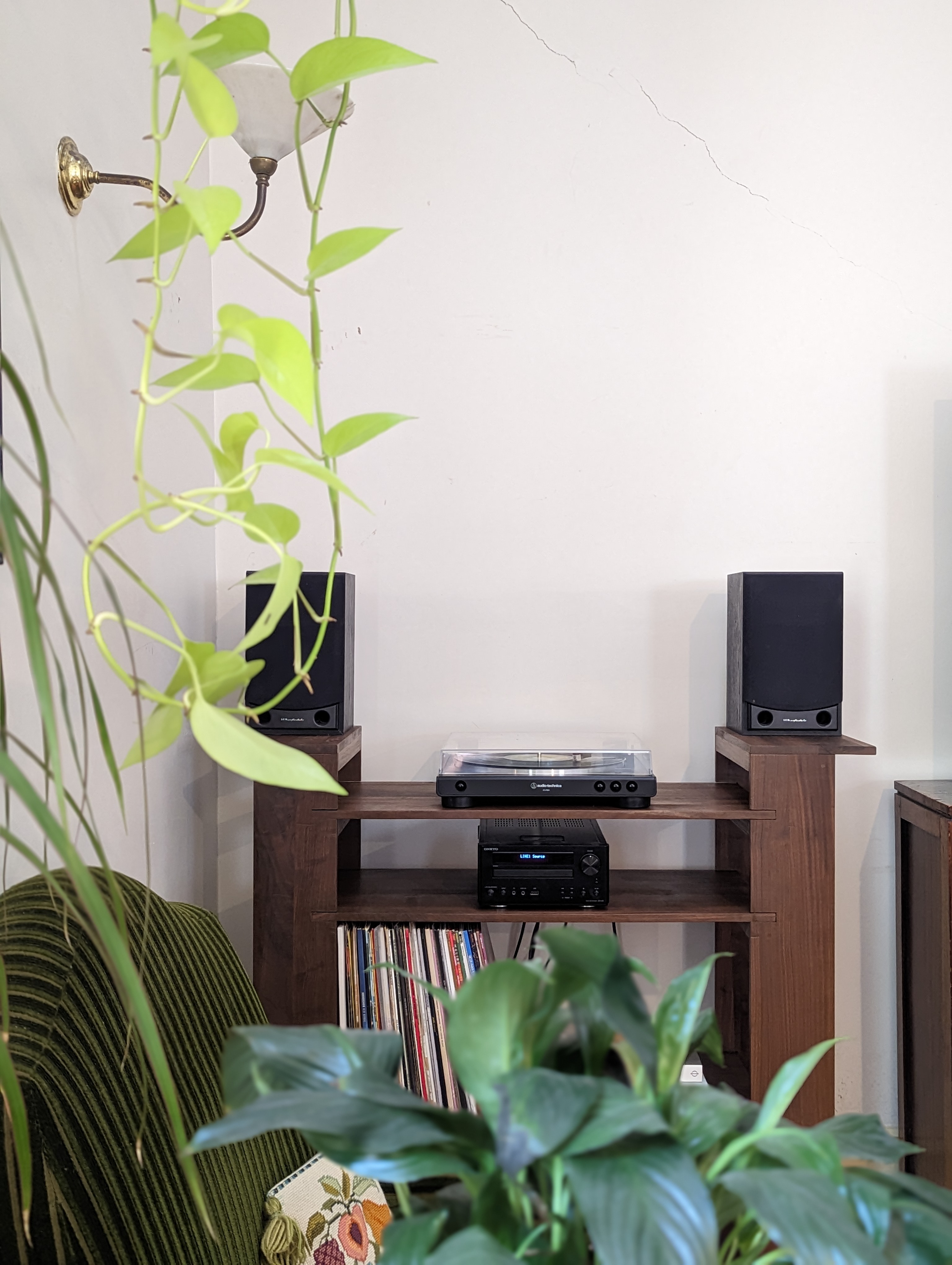 The project came about when my house ran out of vinyl storage when a new housemate moved in. I wanted to create something unique that matched other pieces of funirture we have and could house; all our new records, the stereo and speaker system, as well as the turntable. It posed a fun challenge as the off cuts were all about 800 x 300 x 15 mm however had a 150 x 15 x 15 mm slot cut down the middle where two pieces would slide together to create an X shape. This meant I had to cut everything up and jigsaw it back together.